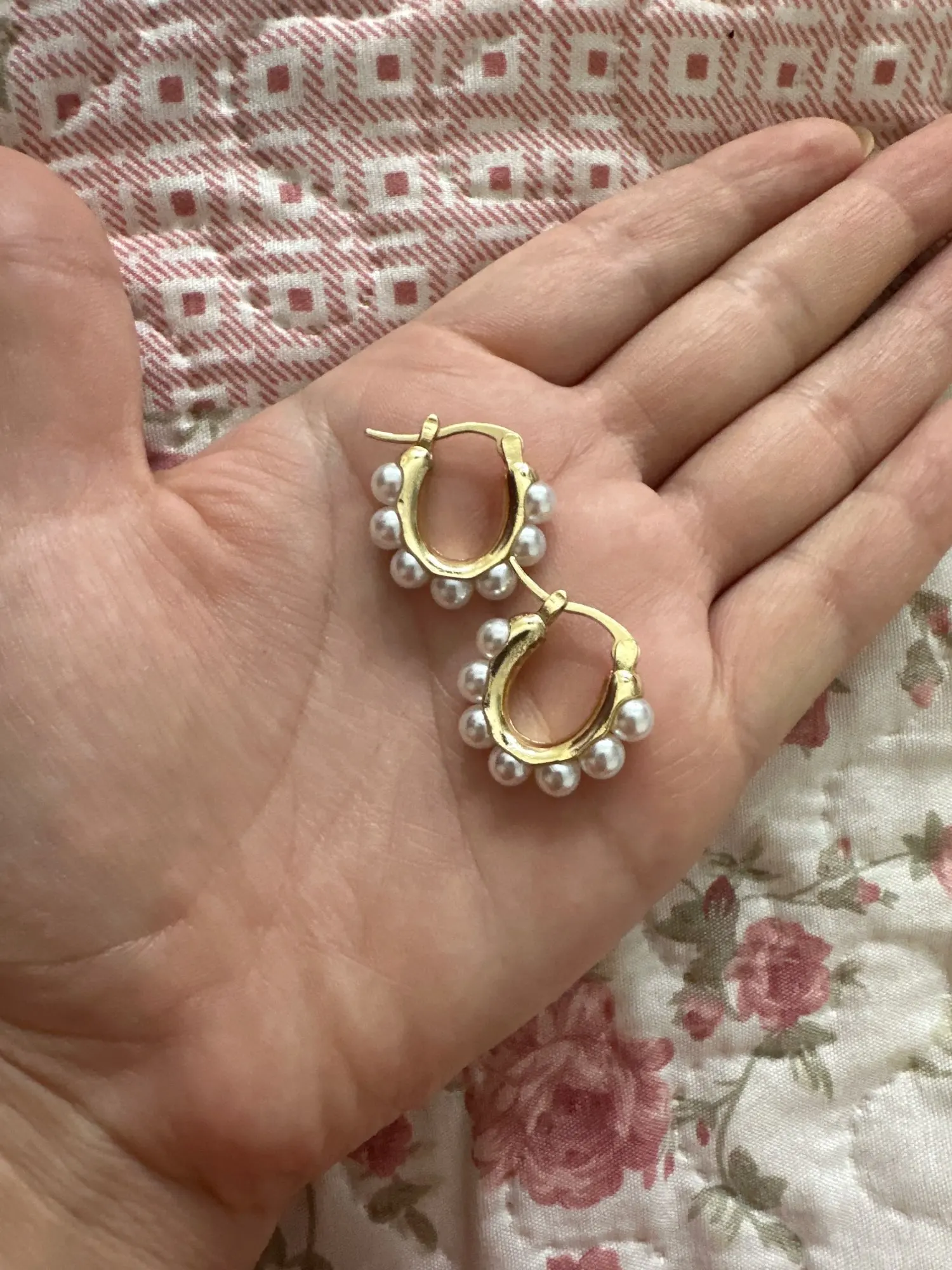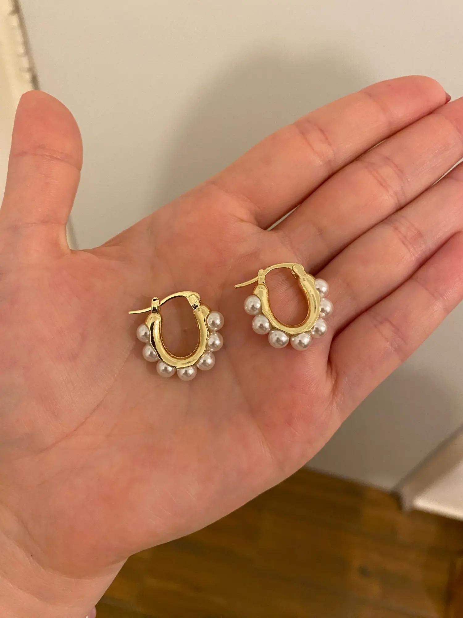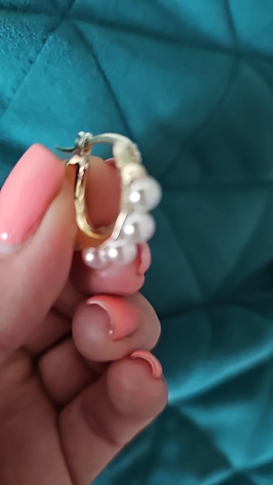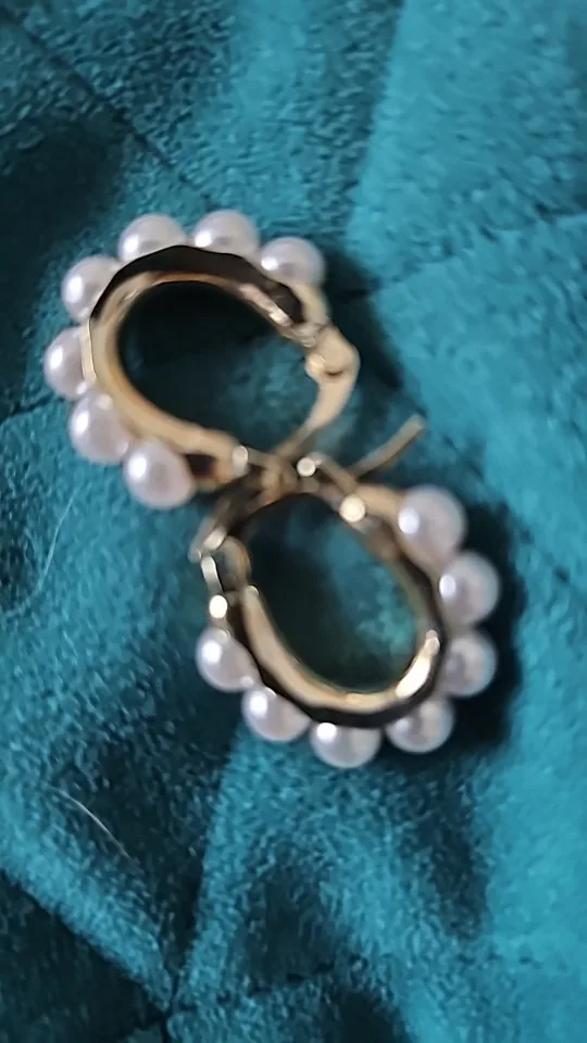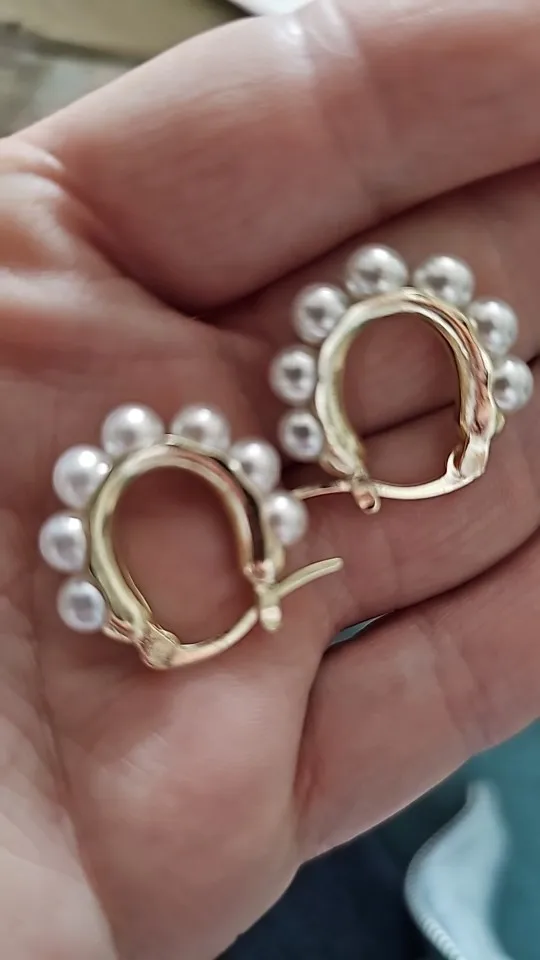 Ebba Bauch Small size gold metal earrings with half Pearl appliques around super elegant and sophisticated, the brooch works well and its size is perfect for wearing any outfit, I love it as light with them on