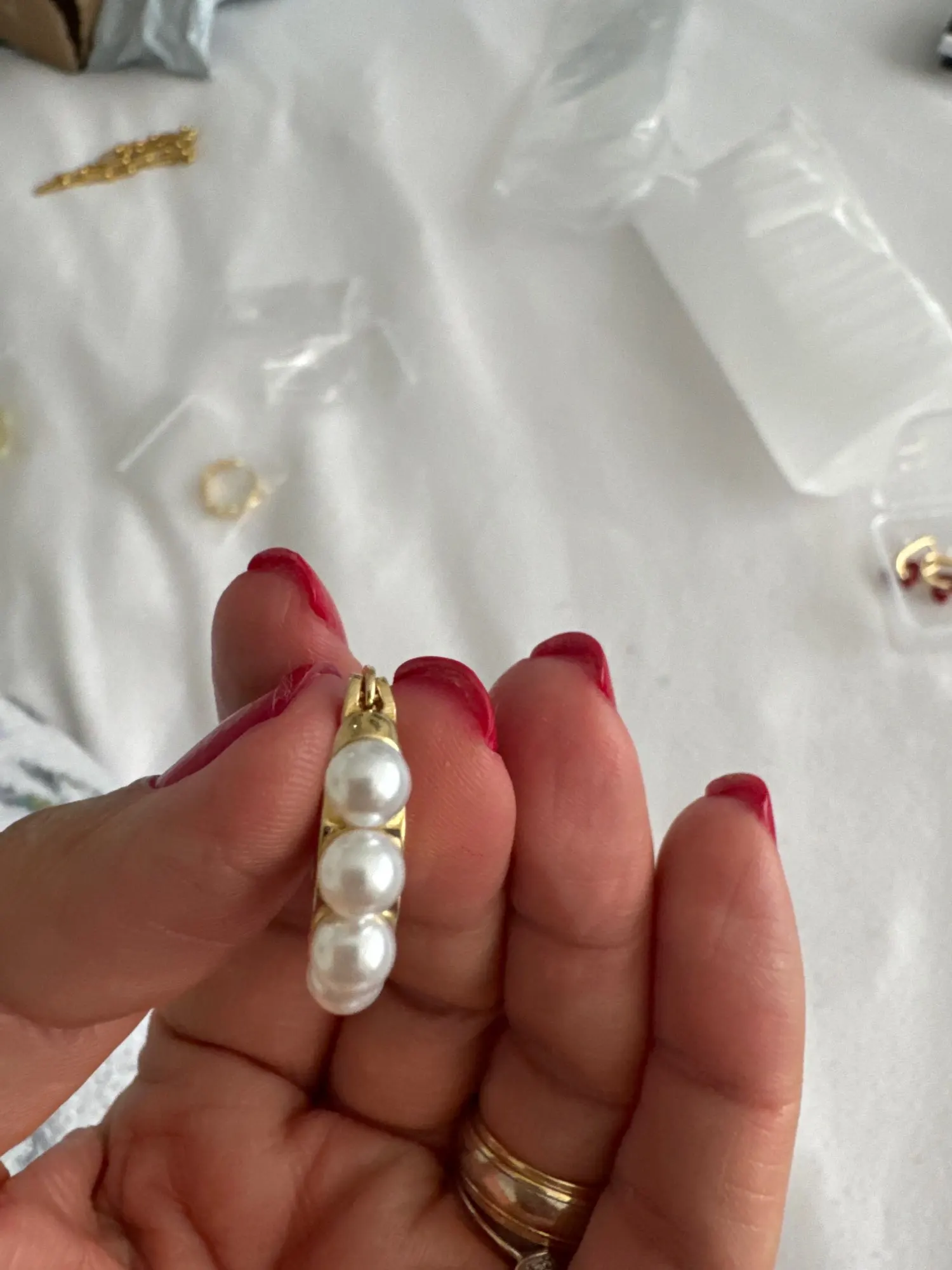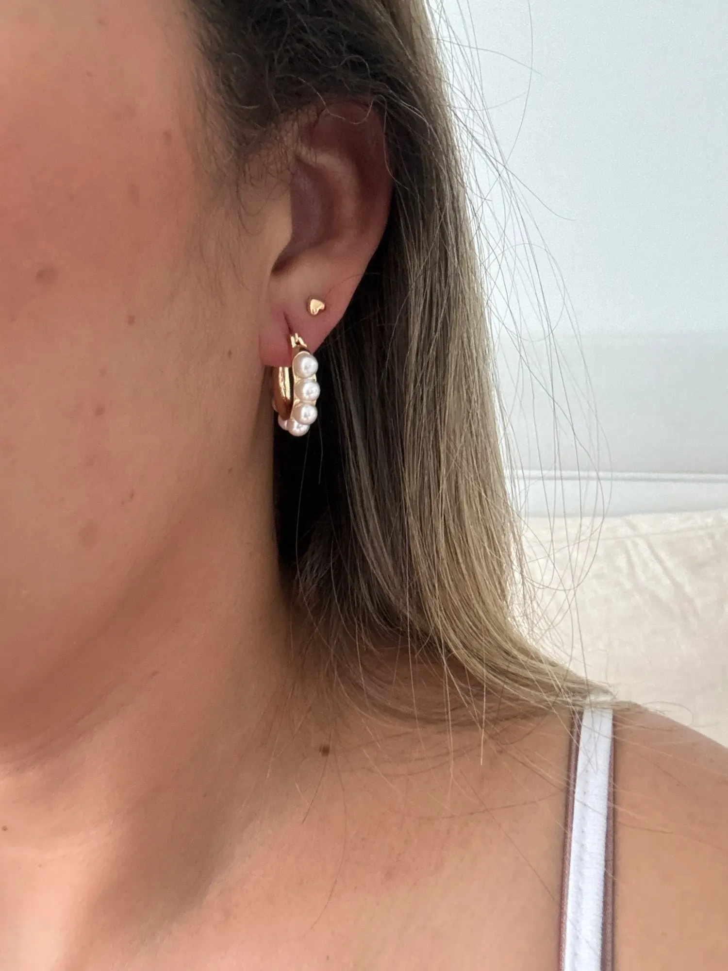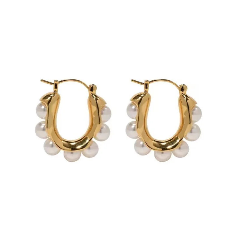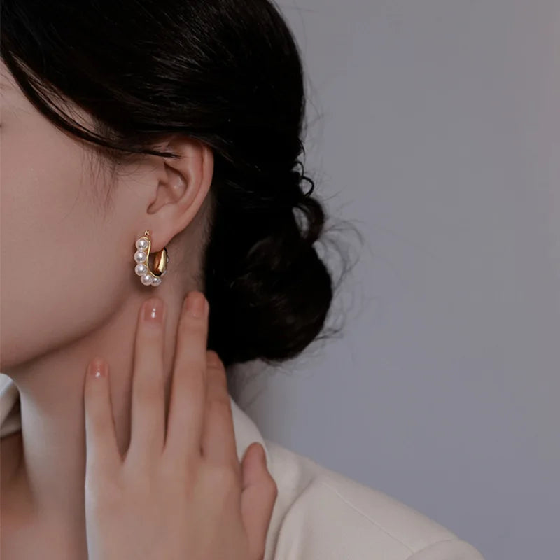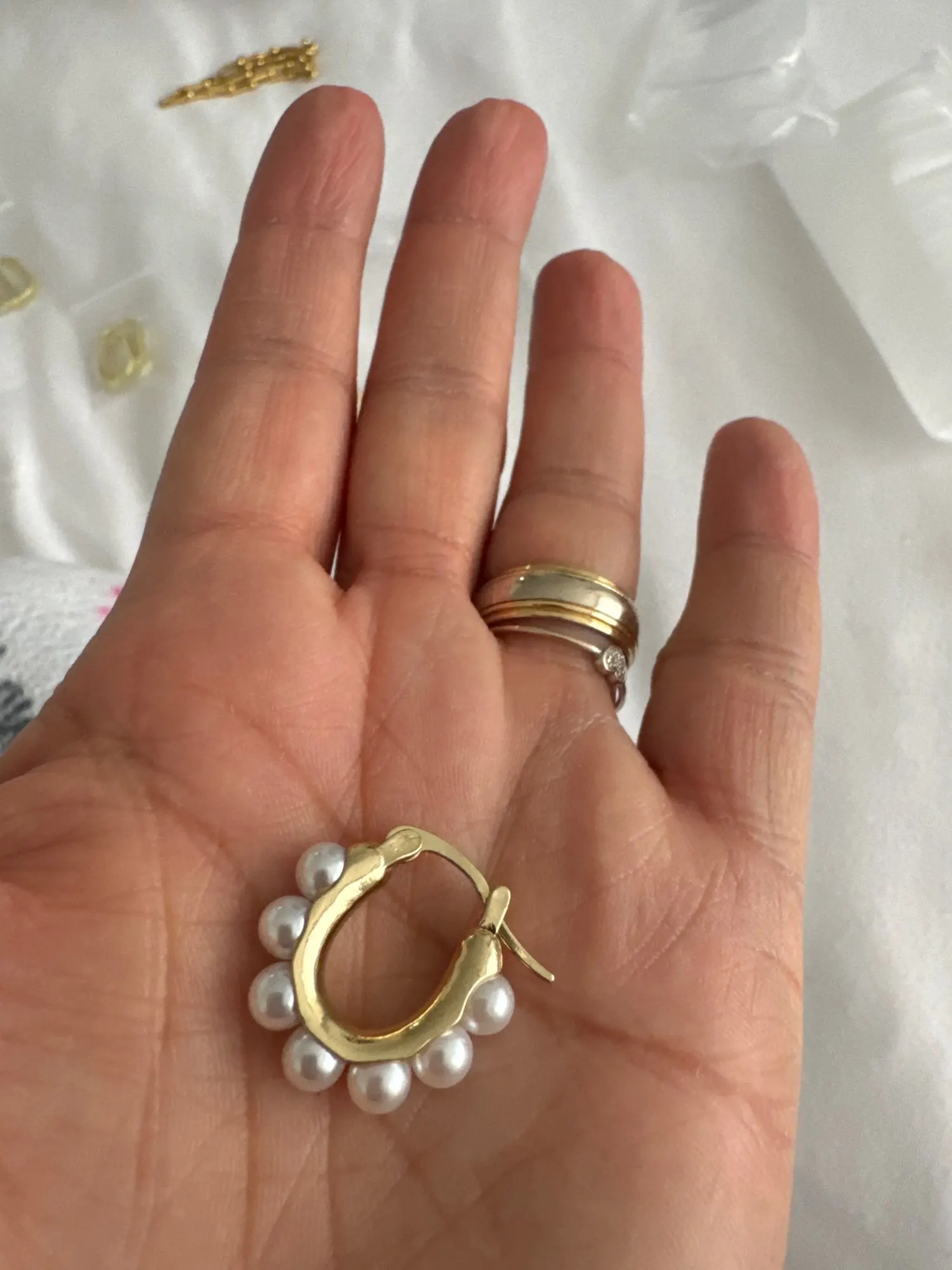Ebba Bauch Small size gold metal earrings with half Pearl appliques around super elegant and sophisticated, the brooch works well and its size is perfect for wearing any outfit, I love it as light with them on
